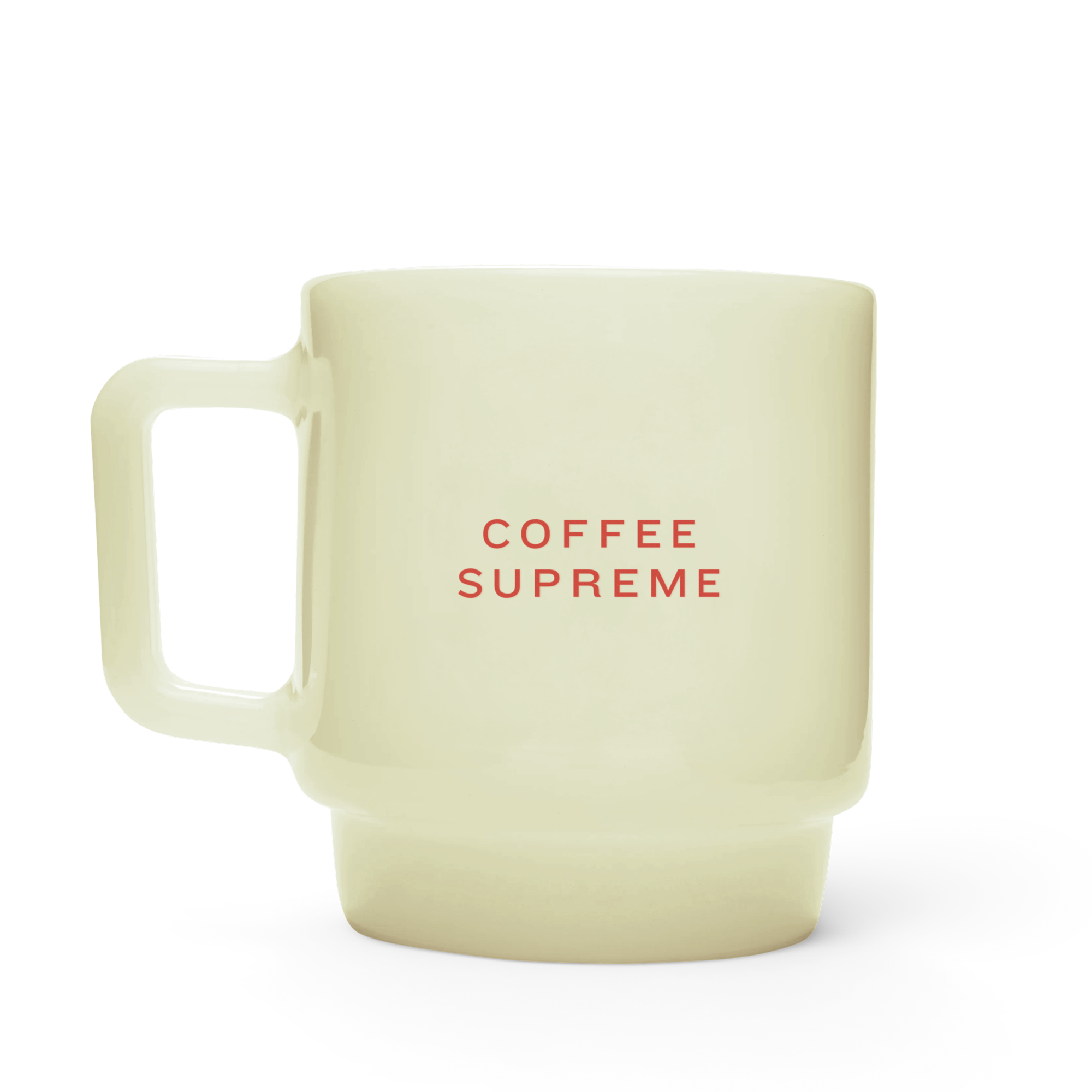 クラシックなマグらしく、クラシックなCoffee Supremeのロゴをあしらったスタッキングマグカップです。300ml弱の大容量に加え、男性でも指2本でゆったり持てるハンドルが特徴です。